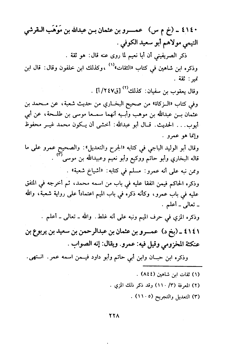 ٤١٤٠ - (خ م س) عمرو بن عثمان بن عبد الله بن موهب القرشي التيمي مولاهم أبو سعيد الكوفي.
