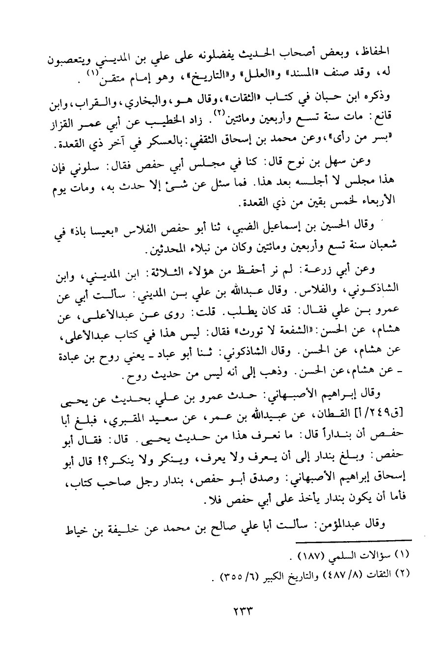 الحفاظ، وبعض أصحاب الحديث يفضلونه على علي ابن المديني ويتعصبون له، وقد صنف " المسند " و " العلل " و " التاريخ "، وهو إمام متقن.