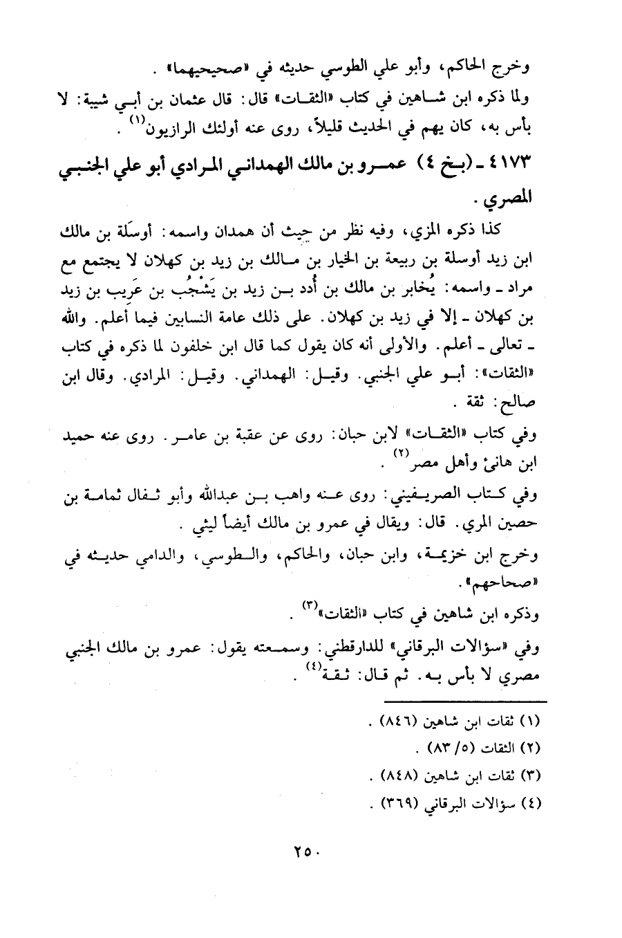 كذا ذكره المزي، وفيه نظر من حيث إن همدان واسمه: أوسلة بن مالك بن زيد أوسلة بن ربيعة بن الخيار بن مالك بن زيد بن كهلان لا يجتمع مع مراد – واسمه: يخابر بن مالك بن أدد بن زيد بن يشجب بن عريب بن زيد بن كهلان – إلا في زيد بن كهلان. على ذلك عامة النسابين فيما أعلم. والله – تعالى – أعلم. والأولى أنه كان يقول كما قال ابن خلفون لما ذكره في كتاب " الثقات ": أبو علي الجنبي. وقيل: الهمداني. وقيل: المرادي. وقال ابن صالح: ثقة.