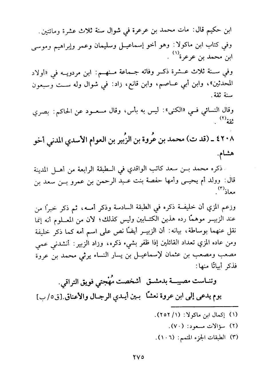 وزعم المزي أن خليفة ذكره في الطبقة السادسة وذكر أمه، ثم ذكر خبرًا من عند الزبير موهمًا رده هذين الكتابين وليس كذلك؛ لأن من المعلوم أنه إنما نقل عنهما بوساطة، بيانه: أن الزبير أيضًا نص على اسم أمه كما ذكر خليفة، ومن عادة المزي تعداد القائلين إذا ظفر بشيء ذكره، وزاد الزبير: أنشدني عمي مصعب ومصعب بن عثمان لإسماعيل بن يسار النساء يرثي محمد بن عروة؛ فذكر أبياتًا منها:
