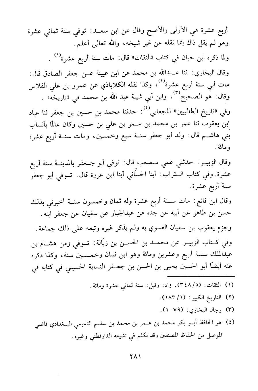 وقال البخاري: ثنا عبد الله بن محمد عن ابن عيينة عن جعفر الصادق قال: مات أبي سنة أربع عشرة، وكذا نقله الكلاباذي عن عمرو بن علي الفلاس. وقال: هو الصحيح، وابن أبي شيبة عبد الله بن محمد في " تاريخه ".