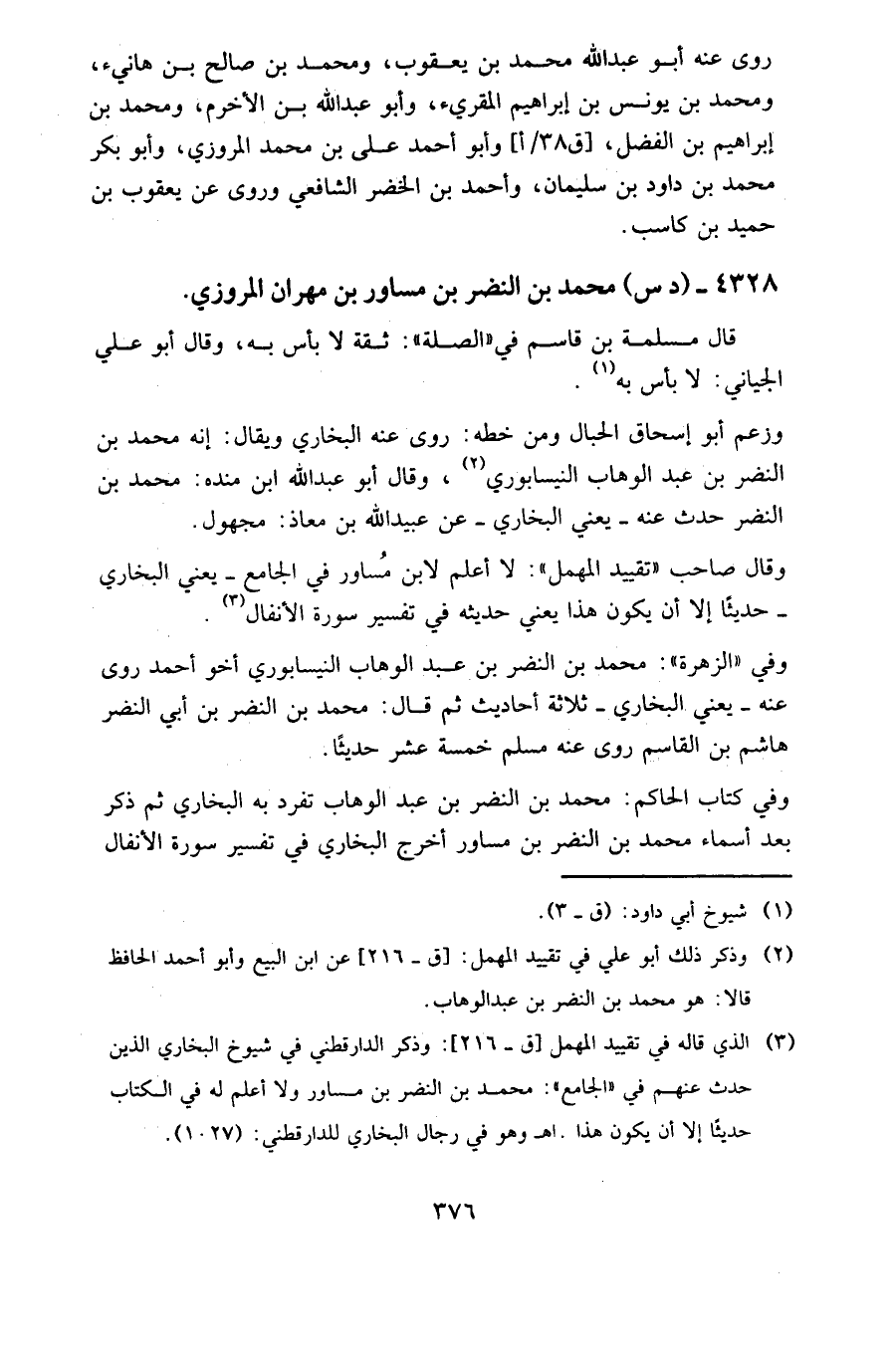 وفي كتاب الحاكم: محمد بن النضر بن عبد الوهاب تفرد به البخاري، ثم ذكر بعد أسماء محمد بن النضر بن مساور أخرج البخاري في تفسير سورة الأنفال