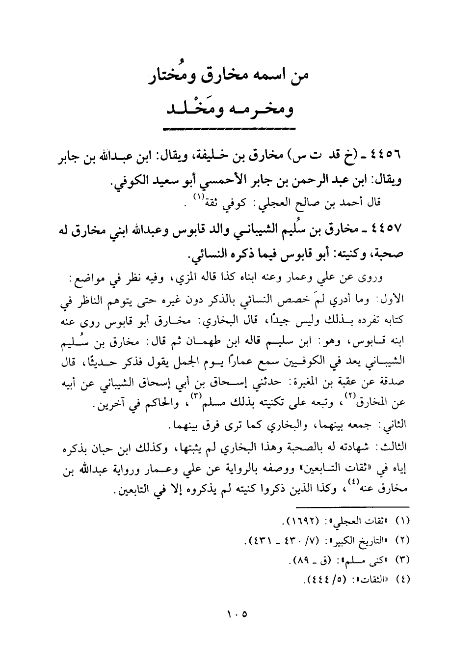 ٤٤٥٧ - مخارق بن سليم الشيباني، والد قابوس وعبد الله ابني مخارق، له صحبة، وكنيته: أبو قابوس فيما ذكره النسائي.