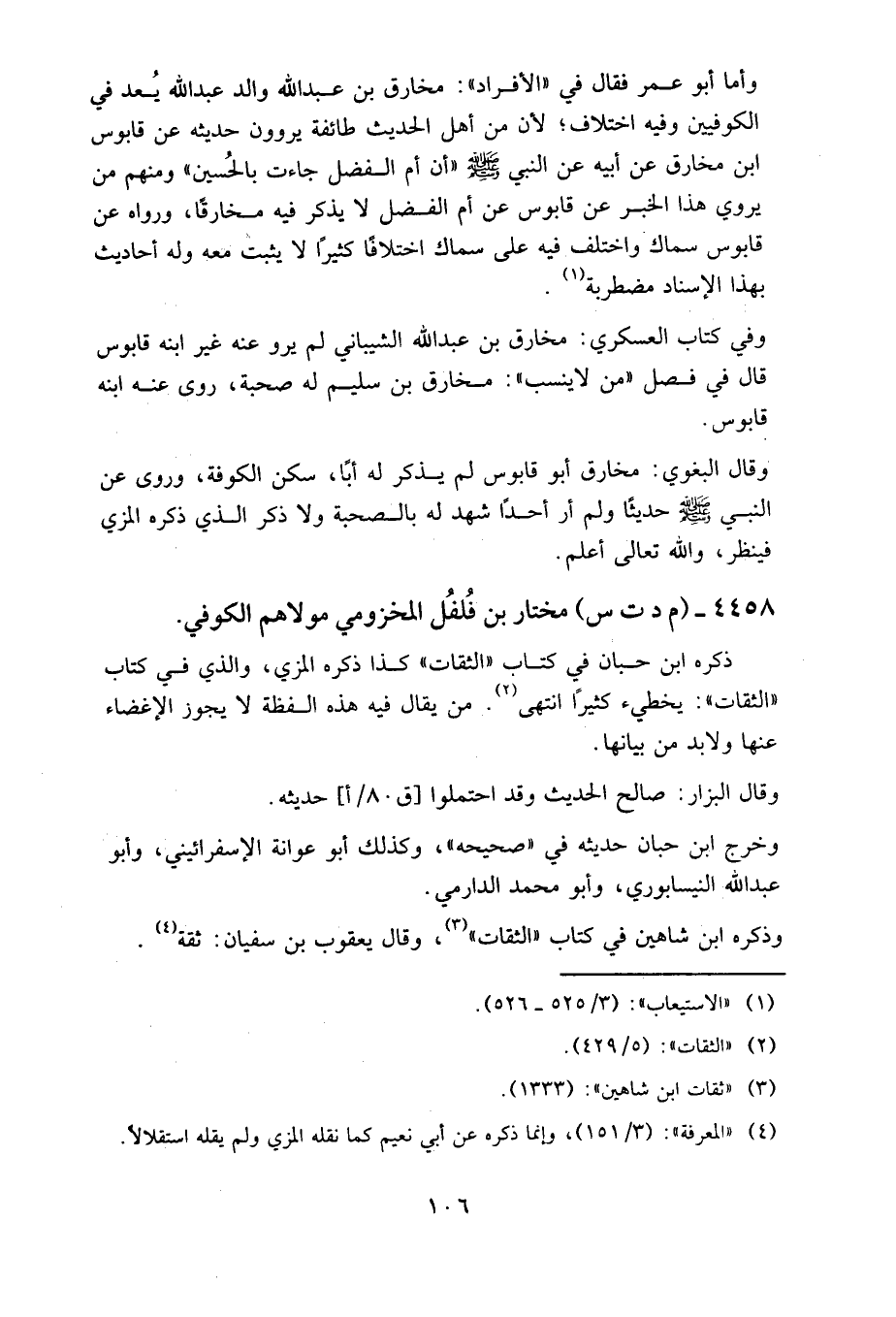 وأما أبو عمر فقال في «الأفراد»: مخارق بن عبد الله والد عبد الله، يعد في الكوفيين، وفيه اختلاف؛ لأن من أهل الحديث طائفة يروون حديثه عن قابوس بن مخارق، عن أبيه، عن النبي صلى الله عليه وسلم " أن أم الفضل جاءت بالحسين "، ومنهم من يروي هذا الخبر عن قابوس عن أم الفضل لا يذكر فيه مخارقا، ورواه عن قابوس سماك، واختلف فيه على سماك اختلافا كثيرا لا يثبت معه، وله أحاديث بهذا الإسناد مضطربة.