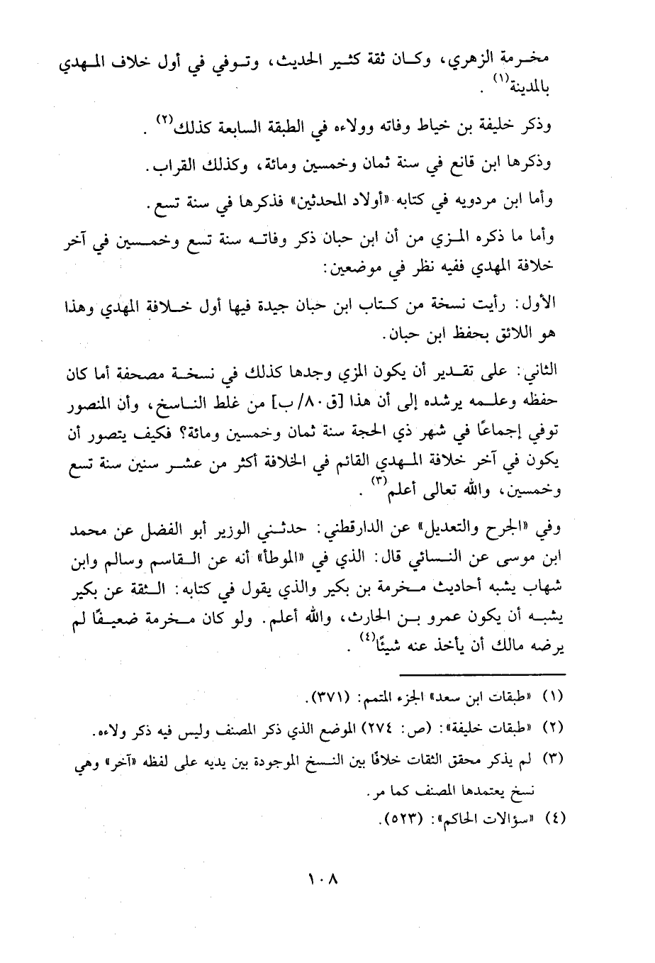 الأول: رأيت نسخة من كتاب ابن حبان جيدة، فيها أول خلافة المهدي، وهذا هو اللائق بحفظ ابن حبان.