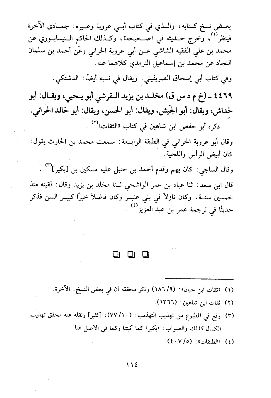 ٤٤٦٩ - (خ م د س ق) مخلد بن يزيد القرشي، أبو يحيى، ويقال: أبو خداش، ويقال: أبو الجيش، ويقال: أبو الحسن، ويقال: أبو خالد الحراني.