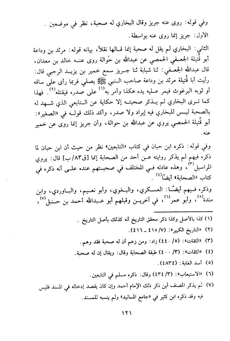 الثاني: البخاري لم يقل له صحبة، إنما قالها نقلا، بيانه قوله: مرثد بن وداعة، أبو قتيلة الجعفي الحمصي عن عبد الله بن حوالة، روى عنه خالد بن معدان، قال عبد الله الجعفي: ثنا شبابة، ثنا جريز سمع خمير بن يزيد الرحبي قال: رأيت أبا قتيلة مرثد بن وداعة صاحب النبي صلى الله عليه وسلم يصلي، فربما رأى على ساقه أو ثوبه البرغوث، فيمر عليه يده هكذا، وأمر به على صدره فيقتله. فهذا كما ترى البخاري لم يذكر صحبته إلا حكاية عن التابعي الذي شهد له بالصحبة، ليس للبخاري فيه إيراد ولا صدر، وأكد ذلك قوله في «الصغير»: أبو قتيلة الحمصي، يروي عن عبد الله بن حوالة، وأن جريزا إنما روى عن خمير عنه.