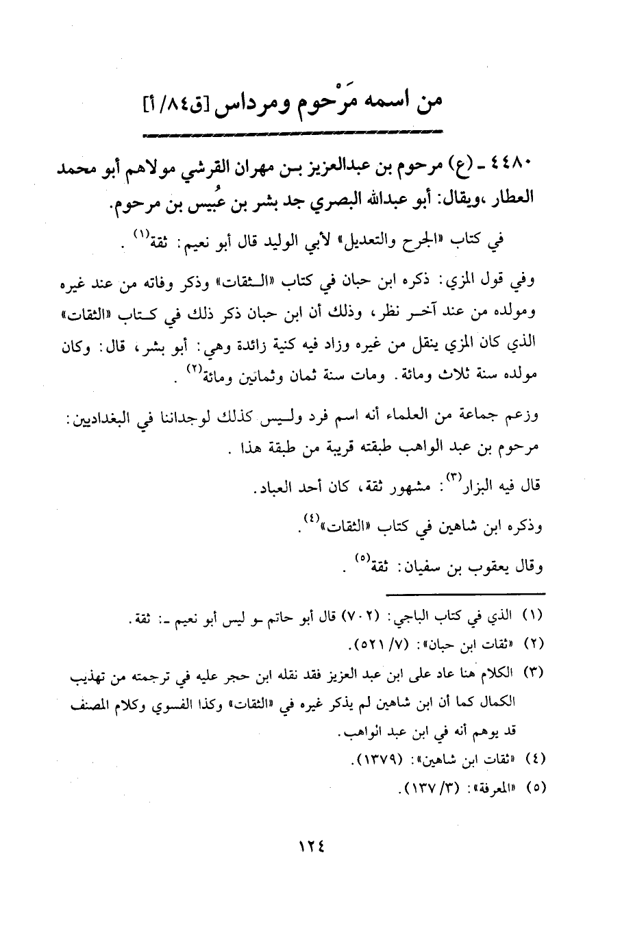 ٤٤٨٠ - (ع) مرحوم بن عبد العزيز بن مهران القرشي مولاهم، أبو محمد العطار، ويقال: أبو عبد الله البصري، جد بشر بن عبيس بن مرحوم.