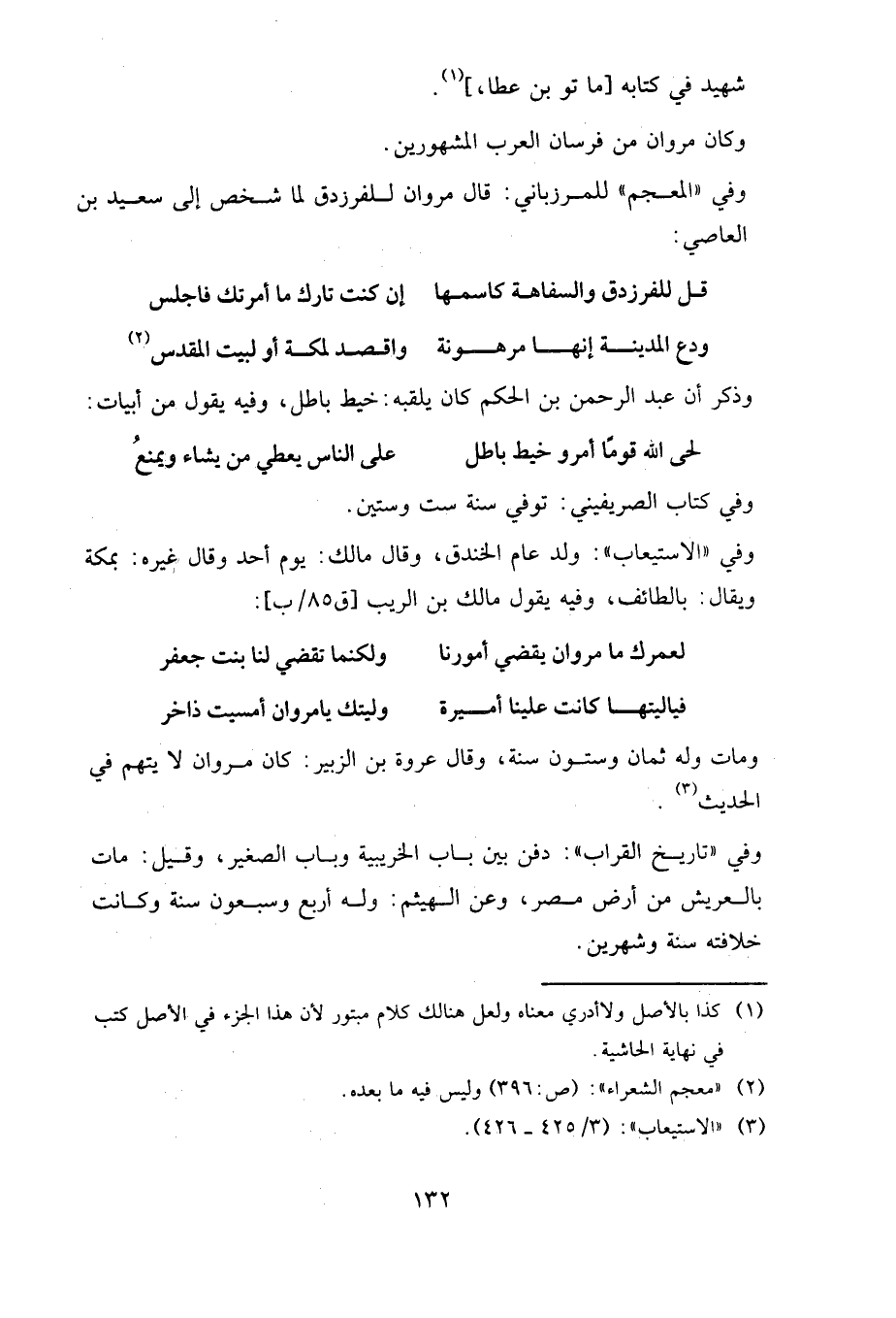 وفي «المعجم» للمرزباني: قال مروان للفرزدق لما شخص إلى سعيد بن العاصي: