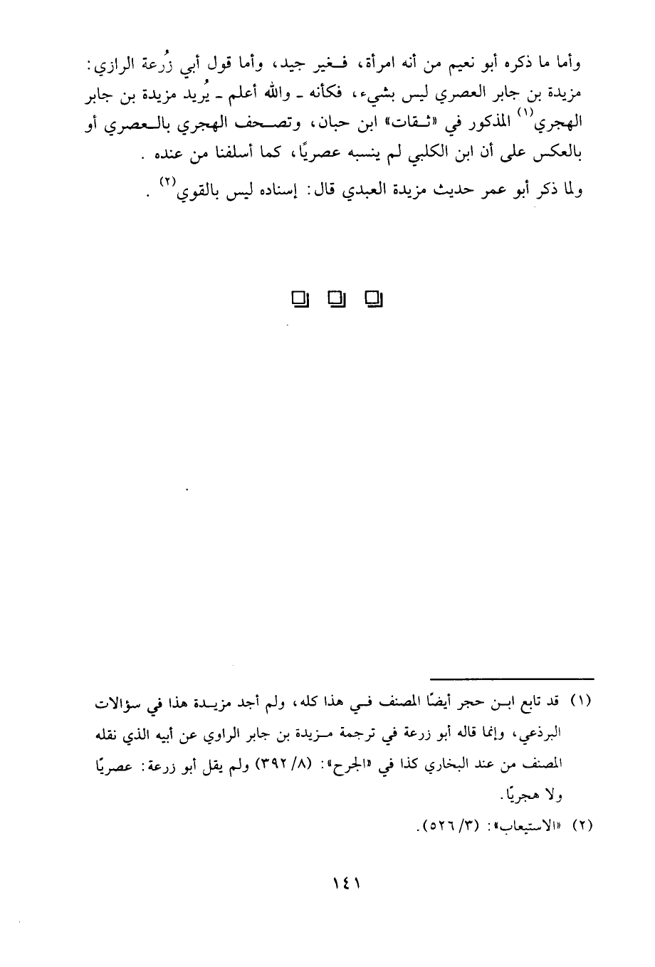 وأما ما ذكره أبو نعيم من أنه امرأة فغير جيد، وأما قول أبي زرعة الرازي: مزيدة بن جابر العصري ليس بشيء، فكأنه - والله أعلم - يريد مزيدة بن جابر الهجري المذكور في «ثقات» ابن حبان، وتصحف الهجري بالعصري أو بالعكس، على أن ابن الكلبي لم ينسبه عصريا، كما أسلفنا من عنده.