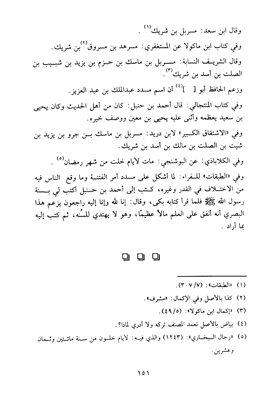 وفي «الطبقات» للفراء: لما أشكل على مسدد أمر الفتنة وما وقع الناس فيه من الاختلاف في القدر وغيره، كتب إلى أحمد بن حنبل: اكتب لي بسنة رسول الله صلى الله عليه وسلم، فلما قرأ كتابه بكى، وقال: إنا لله وإنا إليه راجعون! يزعم هذا البصري أنه أنفق على العلم مالا عظيما وهو لا يهتدي للسنة، ثم كتب إليه بما أراد.
