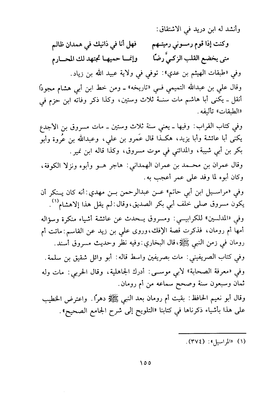 وفي «المدلسين» للكرابيسي: ومسروق يحدث عن عائشة أشياء منكرة، وسؤاله أمها أم رومان، فذكرت قصة الإفك، وروى علي بن زيد عن القاسم: ماتت أم رومان في زمن النبي صلى الله عليه وسلم. قال البخاري: وفيه نظر، وحديث مسروق أسند.