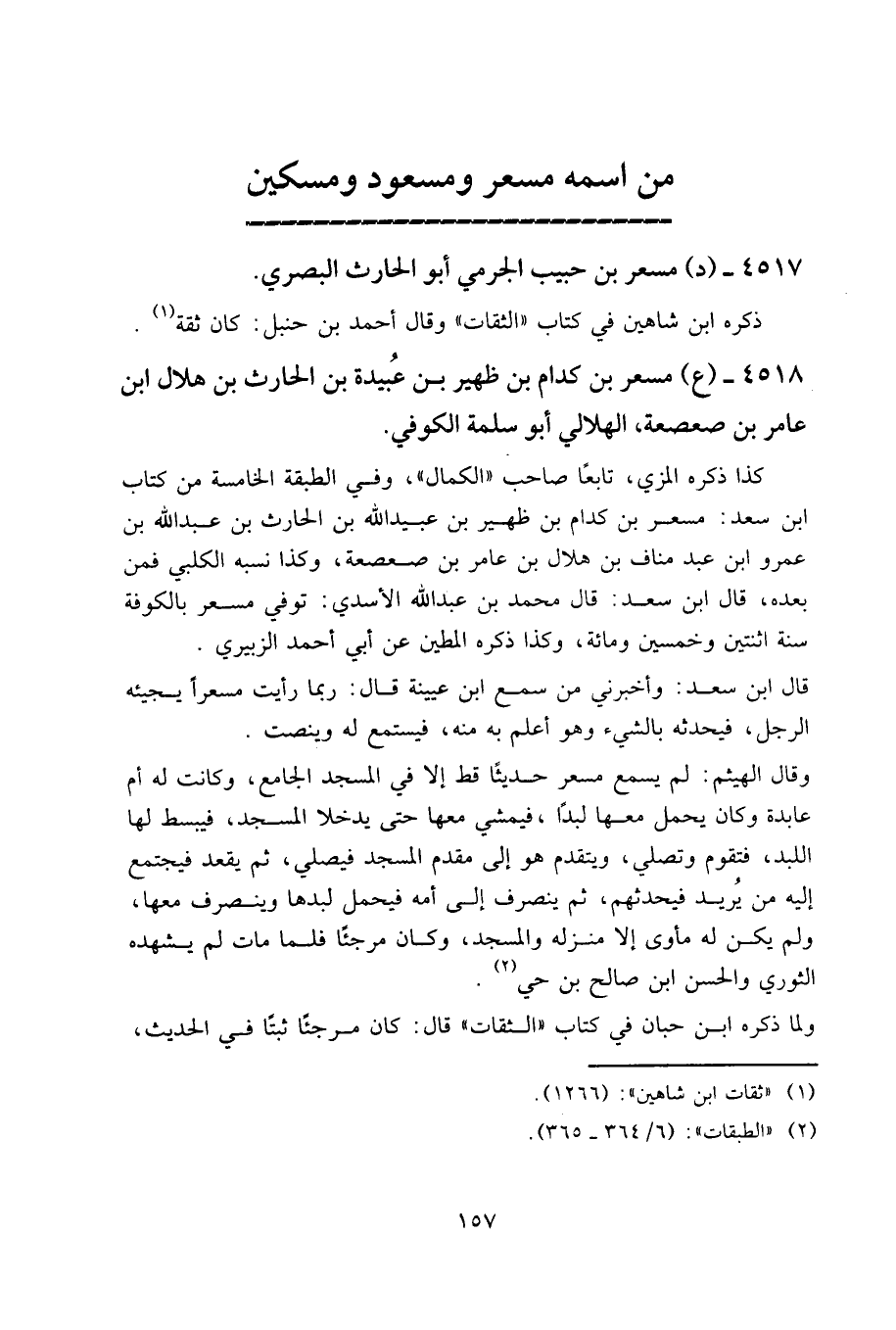 ٤٥١٨ - (ع) مسعر بن كدام بن ظهير بن عبيدة بن الحارث بن هلال ابن عامر بن صعصعة، الهلالي، أبو سلمة الكوفي.