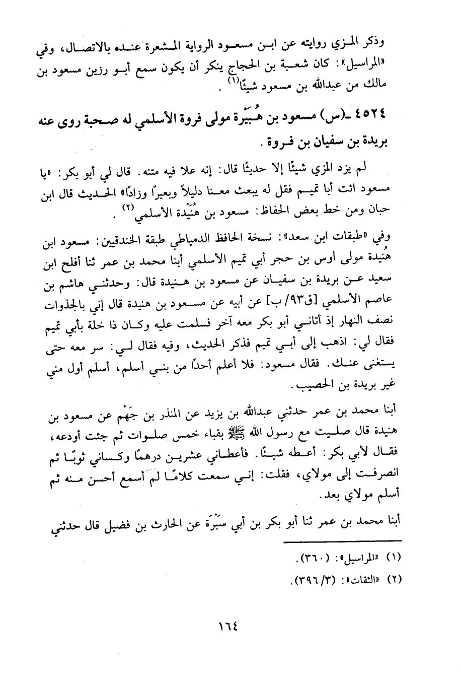 وفي «طبقات ابن سعد» نسخة الحافظ الدمياطي طبقة الخندقيين: مسعود ابن هنيدة مولى أوس بن حجر أبي تميم الأسلمي، أبنا محمد بن عمر، ثنا أفلح ابن سعيد، عن بريدة بن سفيان، عن مسعود بن هنيدة قال: وحدثني هاشم بن عاصم الأسلمي، عن أبيه، عن مسعو بن هنيدة قال: إني بالجذوات نصف النهار إذ أتاني أبو بكر معه آخر، فسلمت عليه، وكان ذا خلة بأبي تميم، فقال لي: اذهب إلى أبي تميم، فذكر الحديث. وفيه فقال لي: سر معه حتى يستغني عنك. فقال مسعود: فلا أعلم أحدا من بني أسلم أسلم أول مني غير بريدة بن الحصيب.