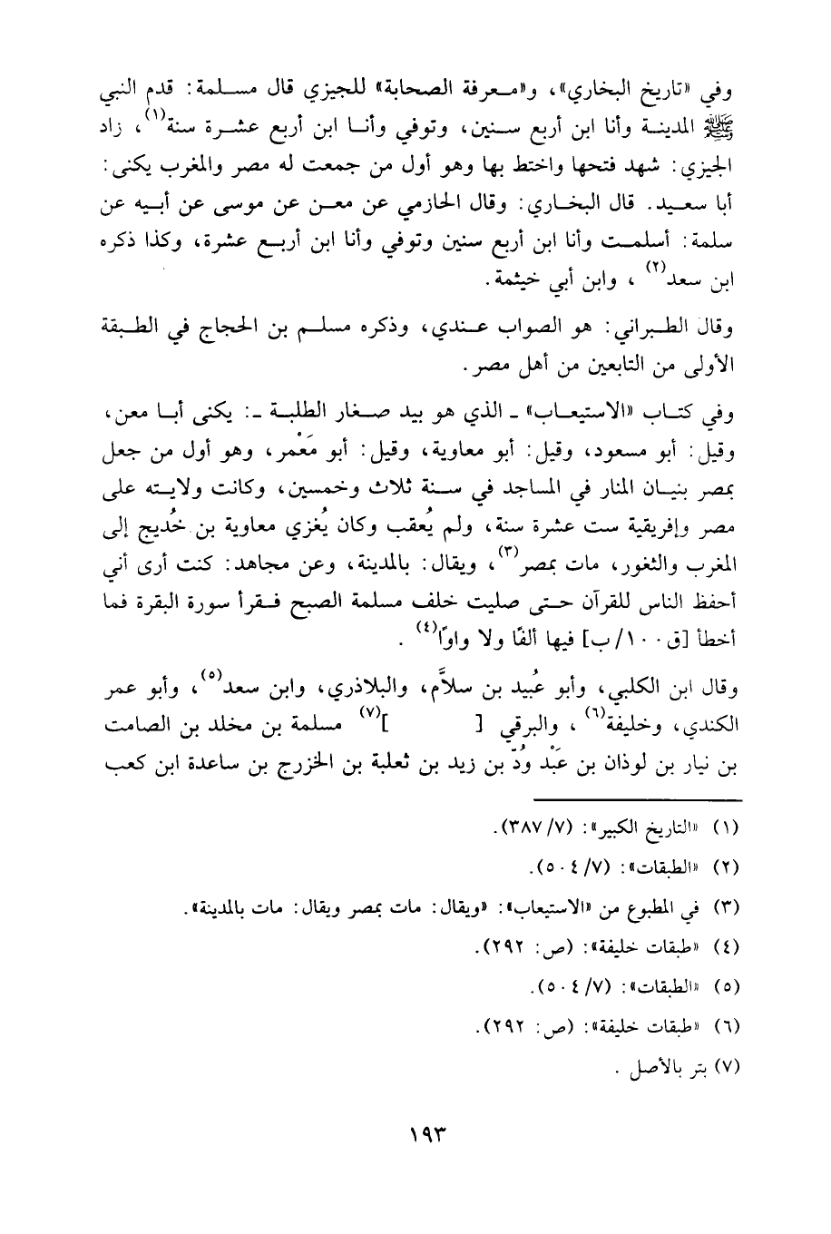 وفي كتاب «الاستيعاب» - الذي هو بيد صغار الطلبة: يكنى أبا معن، وقيل: أبو مسعود، وقيل: أبو معاوية، وقيل: أبو معمر، وهو أول من جعل بمصر بنيان المنار في المساجد في سنة ثلاث وخمسين، وكانت ولايته على مصر وإفريقية ست عشرة سنة، ولم يعقب، وكان يغزي معاوية بن خديج إلى المغرب والثغور، مات بمصر، ويقال: بالمدينة، وعن مجاهد: كنت أرى أني أحفظ الناس للقرآن حتى صليت خلف مسلمة الصبح فقرأ سورة البقرة، فما أخطأ فيها ألفا ولا واوا.