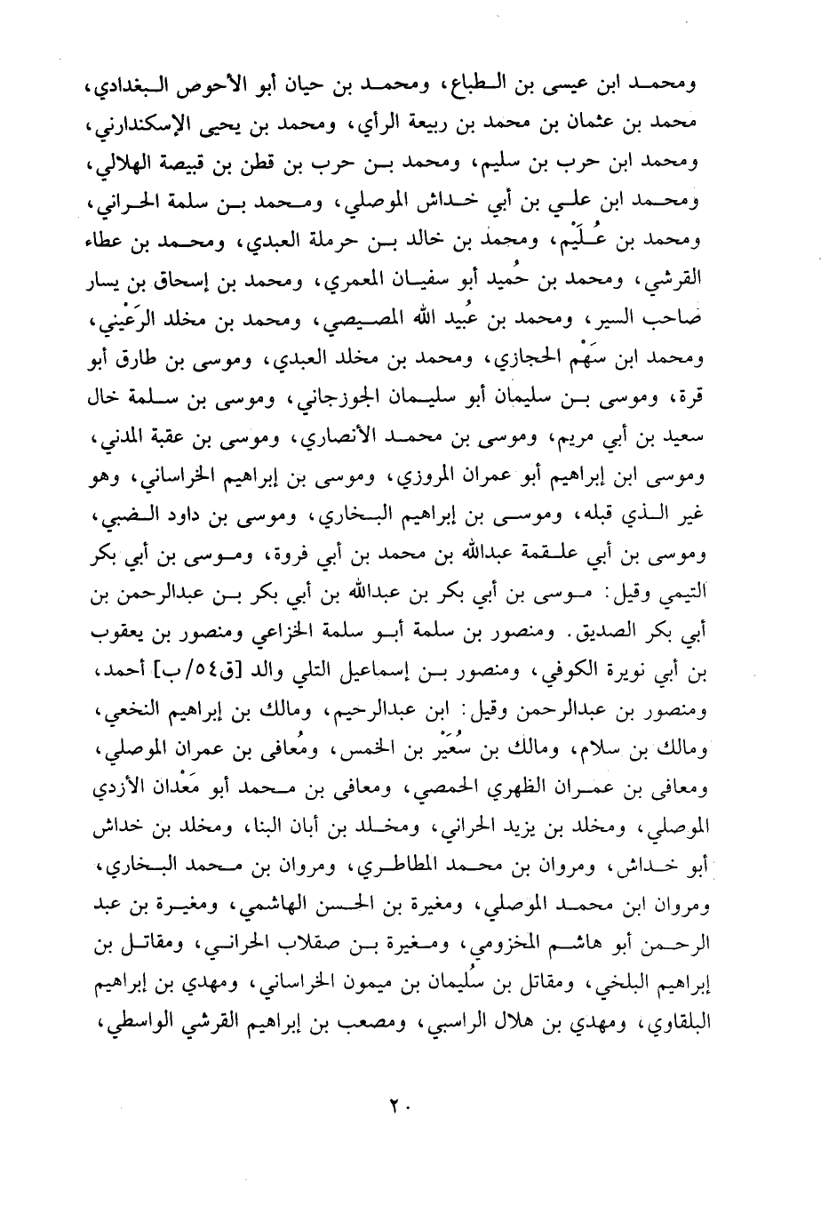 ومحمد ابن عيسى بن الطباع، ومحمد بن حيان أبو الأحوص البغدادي، ومحمد بن عثمان بن محمد بن ربيعة الرأي، ومحمد بن يحيى الإسكندراني، ومحمد ابن حرب بن سليم، ومحمد بن حرب بن قطن بن قبيصة الهلالي، ومحمد ابن علي بن أبي خداش الموصلي، ومحمد بن سلمة الحراني، ومحمد بن عليم، ومحمد بن خالد بن حرملة العبدي، ومحمد بن عطاء القرشي، ومحمد بن حميد أبو سفيان المعمري، ومحمد بن إسحاق بن يسار صاحب السير، ومحمد بن عبيد الله المصيصي، ومحمد بن مخلد الرعيني، ومحمد ابن سهم الحجازي، ومحمد بن مخلد العبدي، وموسى بن طارق أبو قرة، وموسى بن سليمان أبو سليمان الجوزجاني، وموسى بن سلمة خال سعيد بن أبي مريم، وموسى بن محمد الأنصاري، وموسى بن عقبة المدني، وموسى ابن إبراهيم أبو عمران المروزي، وموسى بن إبراهيم الخراساني، وهو غير الذي قبله، وموسى بن إبراهيم البخاري، وموسى بن داود الضبي، وموسى بن أبي علقمة عبد الله بن محمد بن أبي فروة، وموسى بن أبي بكر التيمي وقيل: موسى بن أبي بكر بن عبد الله بن أبي بكر بن عبد الرحمن بن أبي بكر الصديق، ومنصور بن سلمة أبو سلمة الخزاعي، ومنصور بن يعقوب بن أبي نويرة الكوفي، ومنصور بن إسماعيل التلي والد أحمد، ومنصور بن عبد الرحمن وقيل: ابن عبد الرحيم، ومالك بن إبراهيم النخعي، ومالك بن سلام، ومالك بن سعير بن الخمس، ومعافى بن عمران الموصلي، ومعافى بن عمران الظهري الحمصي، ومعافى بن محمد أبو معدان الأزدي الموصلي، ومخلد بن يزيد الحراني، ومخلد بن أبان البنا، ومخلد بن خداش أبو خداش، ومروان بن محمد المطاطري، ومروان بن محمد البخاري، ومروان ابن محمد الموصلي، ومغيرة بن الحسن الهاشمي، ومغيرة بن عبد الرحمن أبو هاشم المخزومي، ومغيرة بن صقلاب الحراني، ومقاتل بن إبراهيم البلخي، ومقاتل بن سليمان بن ميمون الخراساني، ومهدي بن إبراهيم البلقاوي، ومهدي بن هلال الراسبي، ومصعب بن إبراهيم القرشي الواسطي،