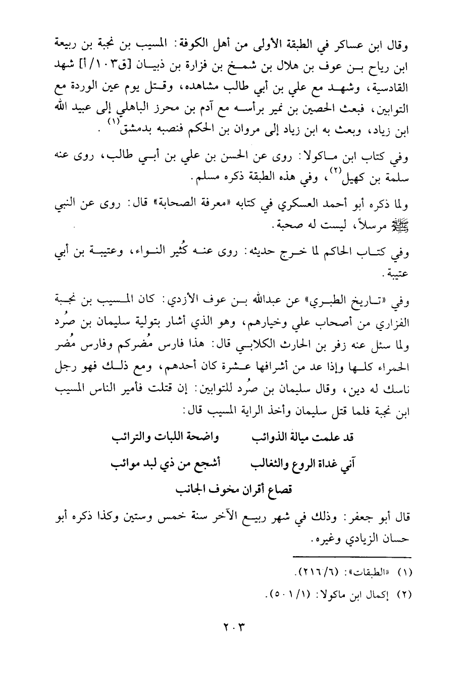وفي «تاريخ الطبري» عن عبد الله بن عوف الأزدي: كان المسيب بن نجبة الفزاري من أصحاب علي وخيارهم، وهو الذي أشار بتولية سليمان بن صرد، ولما سئل عنه زفر بن الحارث الكلابي قال: هذا فارس مضركم، وفارس مضر الحمراء كلها، وإذا عد من أشرافها عشرة كان أحدهم، ومع ذلك فهو رجل ناسك له دين، وقال سليمان بن صرد للتوابين: إن قتلت فأمير الناس المسيب بن نجبة، فلما قتل سليمان وأخذ الراية المسيب قال: