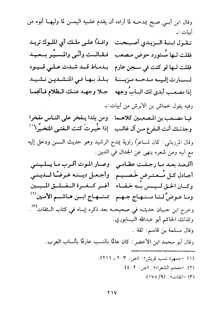 فيا مصعب بن المصعبين كلاهما ... ومن يلدا يفخر على الناس مفخرا