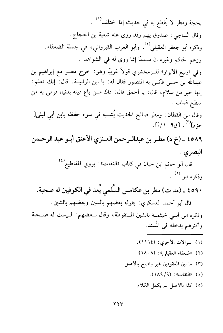 قال أبو حاتم ابن حبان في كتاب «الثقات»: يروي المقاطيع.