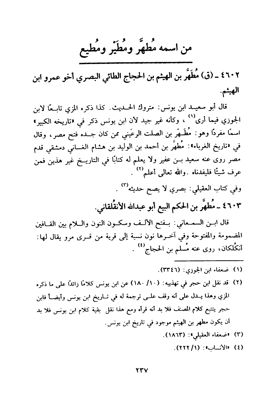٤٦٠٢ - (ق) مطهر بن الهيثم بن الحجاج الطائي البصري، أخو عمرو بن الهيثم.