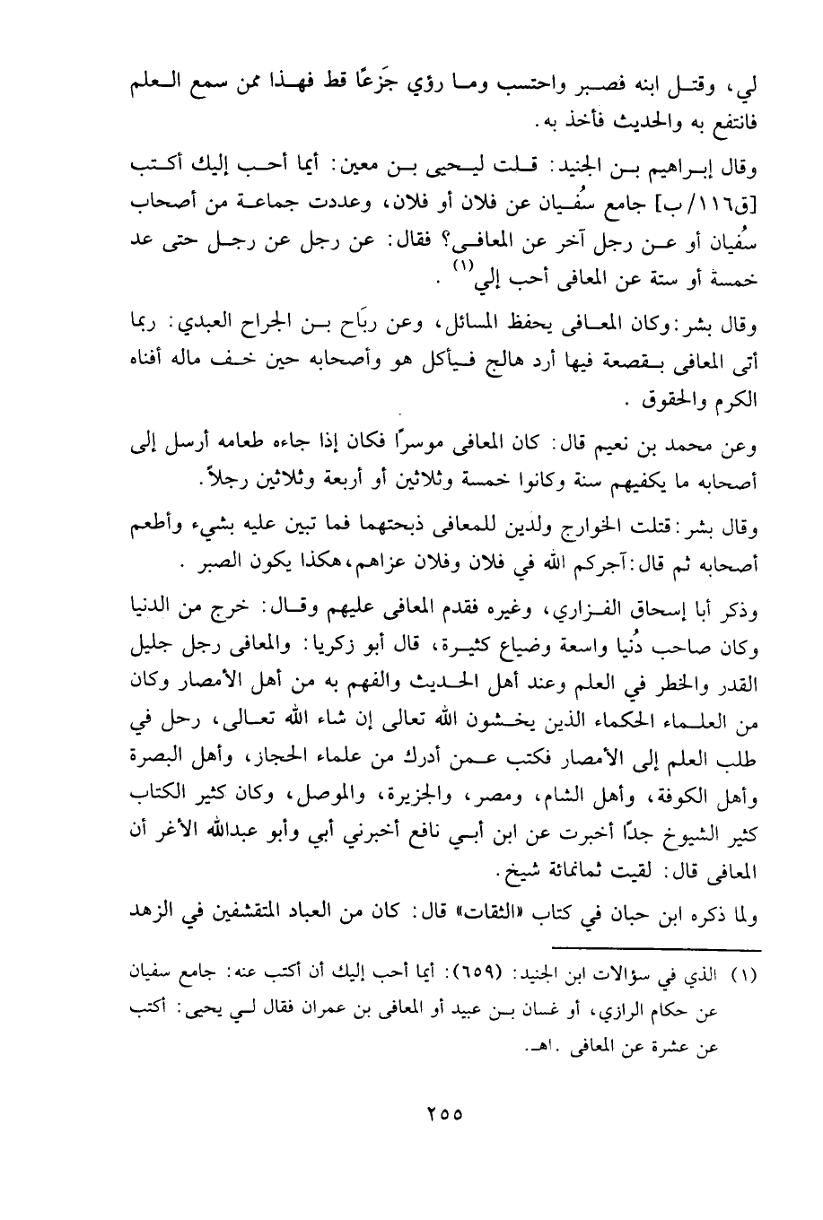وقال إبراهيم بن الجنيد: قلت ليحيى بن معين: أيما أحب إليك أكتب جامع سفيان عن فلان أو فلان؟ وعددت جماعة من أصحاب سفيان، أو عن رجل آخر عن المعافى؟ فقال: عن رجل عن رجل، حتى عد خمسة أو ستة، عن المعافى أحب إلي.