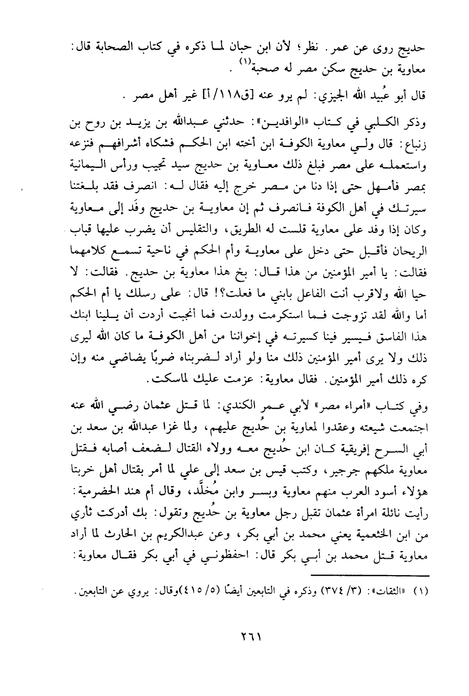 حديج روى عن عمر، نظر؛ لأن ابن حبان لما ذكره في كتاب الصحابة قال: معاوية بن حديج سكن مصر، له صحبة.