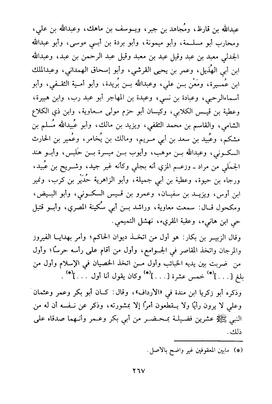 وذكره أبو زكريا ابن مندة في «الأرداف» وقال: كان أبو بكر وعمر وعثمان وعلي لا يرون رأيا ولا يقطعون أمرا إلا بمشورته، وذكر عن نفسه أن له من النبي صلى الله عليه وسلم عشرين فضيلة بمحضر من أبي بكر وعمر، وأنهما صدقاه على ذلك.