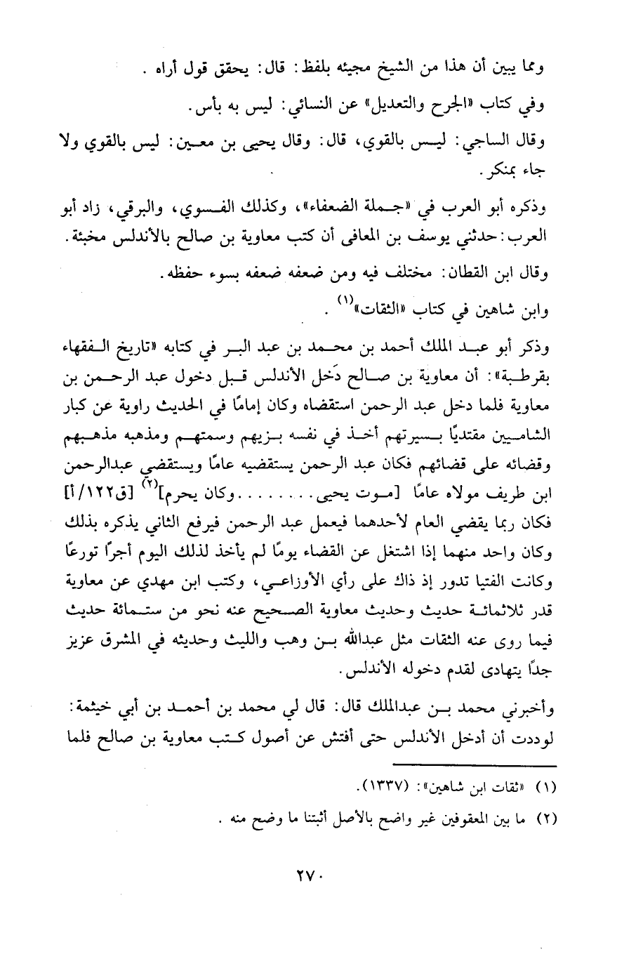 وذكره أبو العرب في «جملة الضعفاء»، وكذلك الفسوي والبرقي، زاد أبو العرب: حدثني يوسف بن المعافى أن كتب معاوية بن صالح بالأندلس مخبئة.
