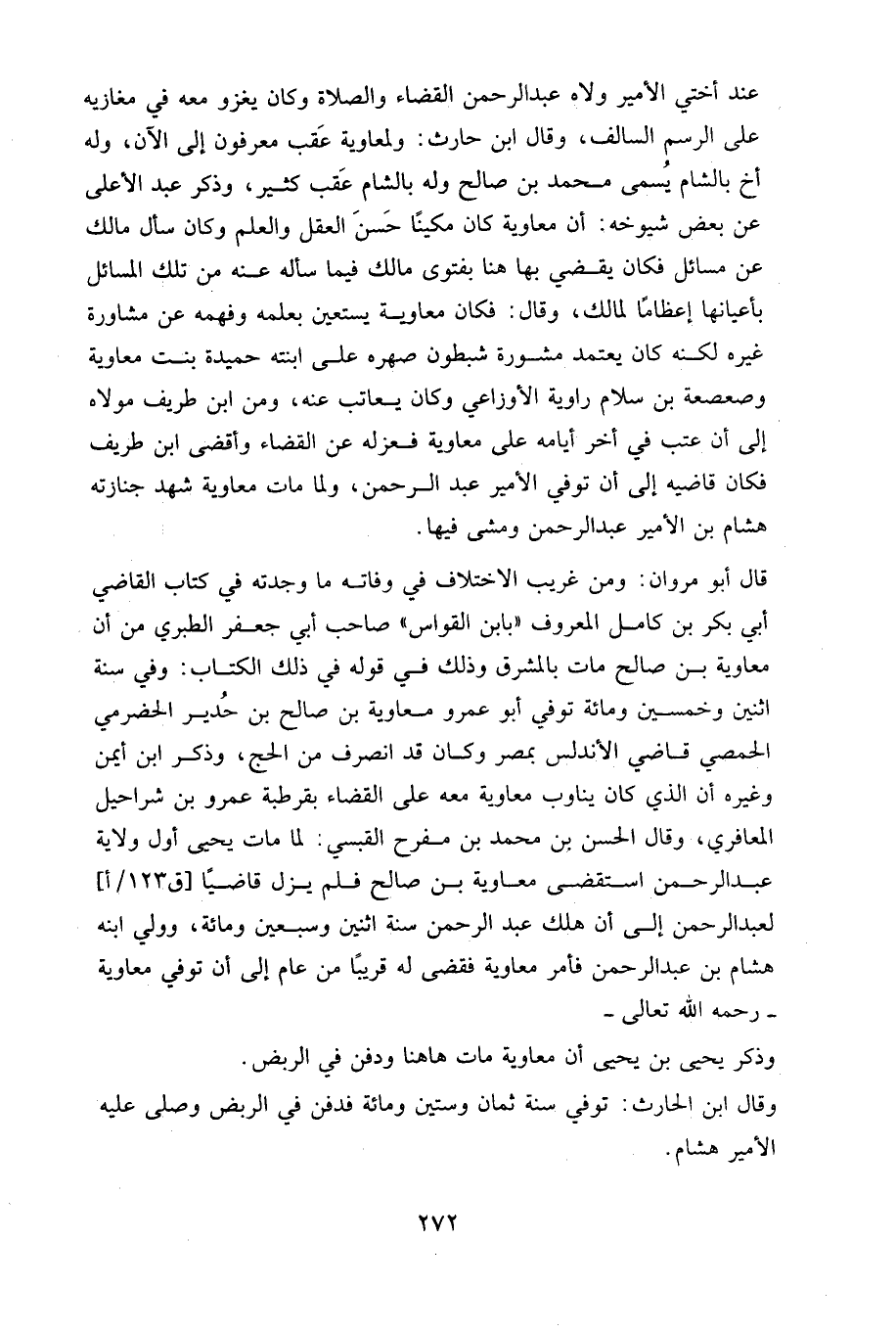 عند أختي الأمير ولاه عبد الرحمن القضاء والصلاة، وكان يغزو معه في مغازيه على الرسم السالف، وقال ابن الحارث: ولمعاوية عقب معرفون إلى الآن، وله أخ بالشام يسمى محمد بن صالح، وله بالشام عقب كثير، وذكر عبد الأعلى عن بعض شيوخه أن معاوية كان مكينا، حسن العقل والعلم، وكان سأل مالكا عن مسائل، فكان يقضي بها هنا بفتوى مالك فيما سأله عنه من تلك المسائل بأعيانها إعظاما لمالك، وقال: فكان معاوية يستعين بعلمه وفهمه عن مشاورة غيره، لكنه كان يعتمد مشورة شبطون صهره على ابنته حميدة بنت معاوية، وصعصعة بن سلام راوية الأوزاعي، وكان يعاتب عنه، ومن ابن طريف مولاه إلى أن عتب في آخر أيامه على معاوية، فعزله عن القضاء، وأقضى ابن طريف، فكان قاضيه إلى أن توفي الأمير عبد الرحمن، ولما مات معاوية شهد جنازته هشام ابن الأمير عبد الرحمن، ومشى فيها.