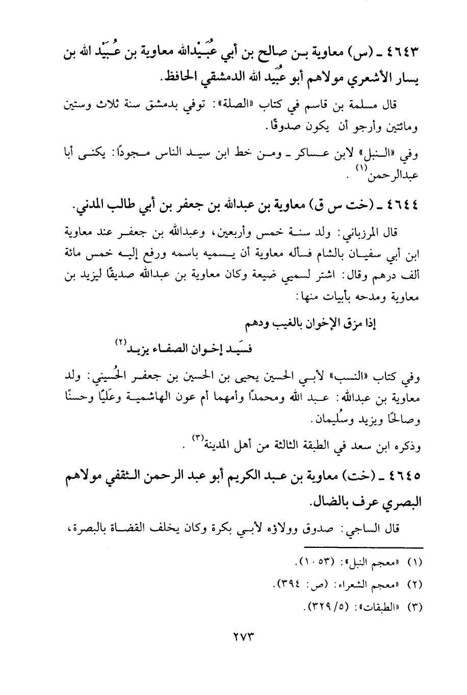 ٤٦٤٣ - (س) معاوية بن صالح بن أبي عبيد الله معاوية بن عبيد الله بن يسار الأشعري مولاهم، أبو عبيد الله، الدمشقي الحافظ.