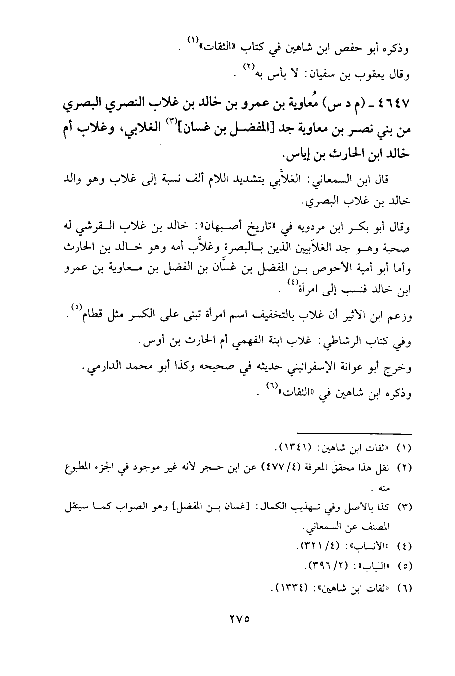 ٤٦٤٧ - (م د س) معاوية بن عمرو بن خالد بن غلاب النصري البصري، من بني نصر بن معاوية، جد المفضل بن غسان الغلابي، وغلاب أم خالد ابن الحارث بن إياس.