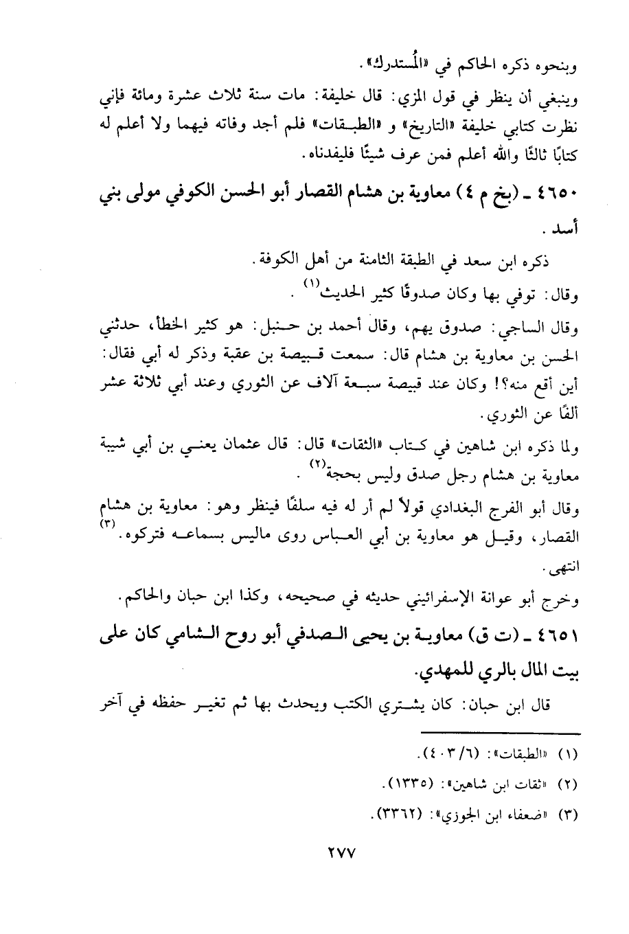 ولما ذكره ابن شاهين في كتاب «الثقات» قال: قال عثمان يعني ابن أبي شيبة: معاوية بن هشام رجل صدق، وليس بحجة.