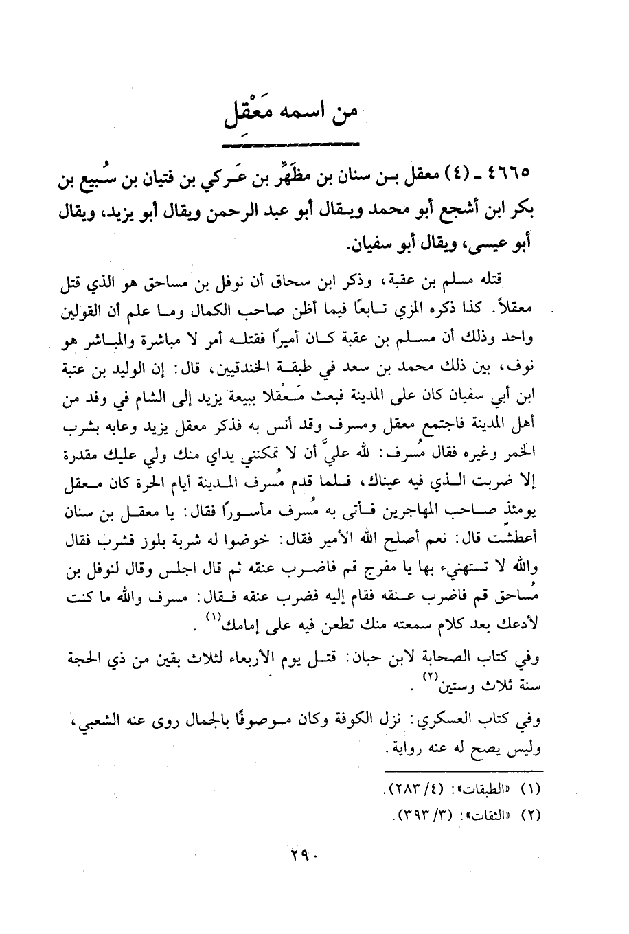 ٤٦٦٥ - (٤) معقل بن سنان بن مظهر بن عركي بن فتيان بن سبيع بن بكر ابن أشجع، أبو محمد، ويقال: أبو عبد الرحمن، ويقال: أبو يزيد، ويقال: أبو عيسى، ويقال: أبو سفيان.