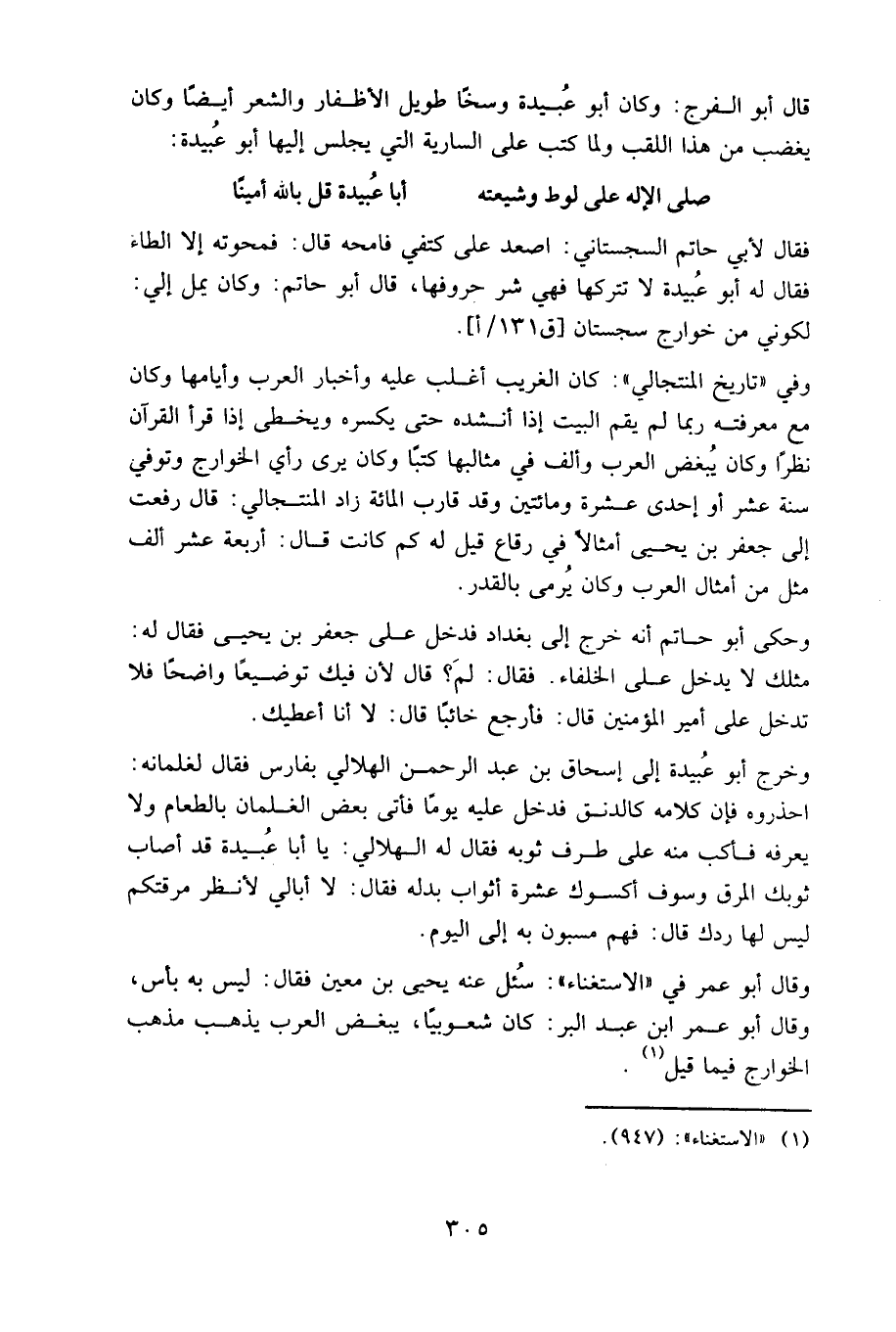 قال أبو الفرج: وكان أبو عبيدة وسخا، طويل الأظفار والشعر أيضا، وكان يغضب من هذا اللقب، ولما كتب على السارية التي يجلس إليها أبو عبيدة: