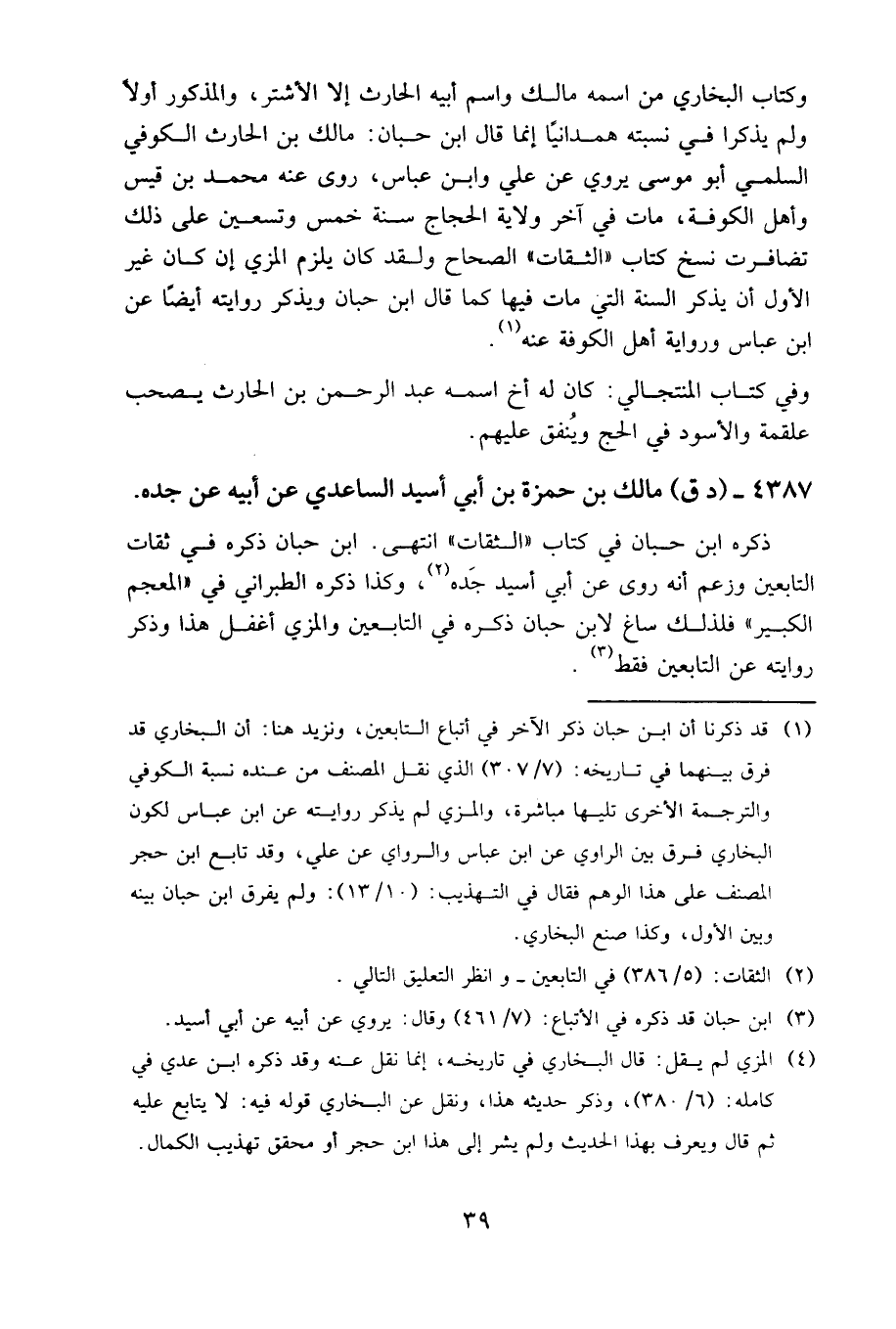 وكتاب البخاري من اسمه مالك واسم أبيه الحارث إلا الأشتر، والمذكور أولا ولم يذكرا في نسبته همدانيا، إنما قال ابن حبان: مالك بن الحارث الكوفي السلمي أبو موسى، يروي عن علي وابن عباس، روى عنه محمد بن قيس وأهل الكوفة، مات في آخر ولاية الحجاج سنة خمس وتسعين، على ذلك تضافرت نسخ كتاب «الثقات» الصحاح، ولقد كان يلزم المزي إن كان غير الأول أن يذكر السنة التي مات فيها كما قال ابن حبان، ويذكر روايته أيضا عن ابن عباس ورواية أهل الكوفة عنه.