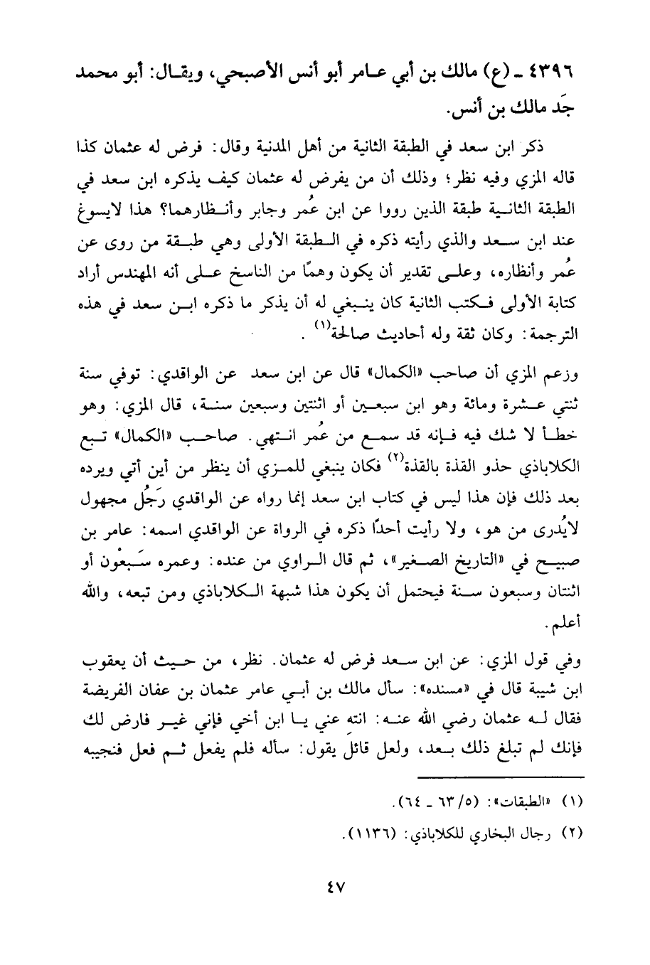 وفي قول المزي عن ابن سعد: فرض له عثمان، نظر، من حيث أن يعقوب بن شيبة قال في «مسنده»: سأل مالك بن أبي عامر عثمان بن عفان الفريضة، فقال له عثمان رضي الله عنه: انته عني يا ابن أخي، فإني غير فارض لك، فإنك لم تبلغ ذلك بعد. ولعل قائل يقول: سأله فلم يفعل، ثم فعل، فنجيبه