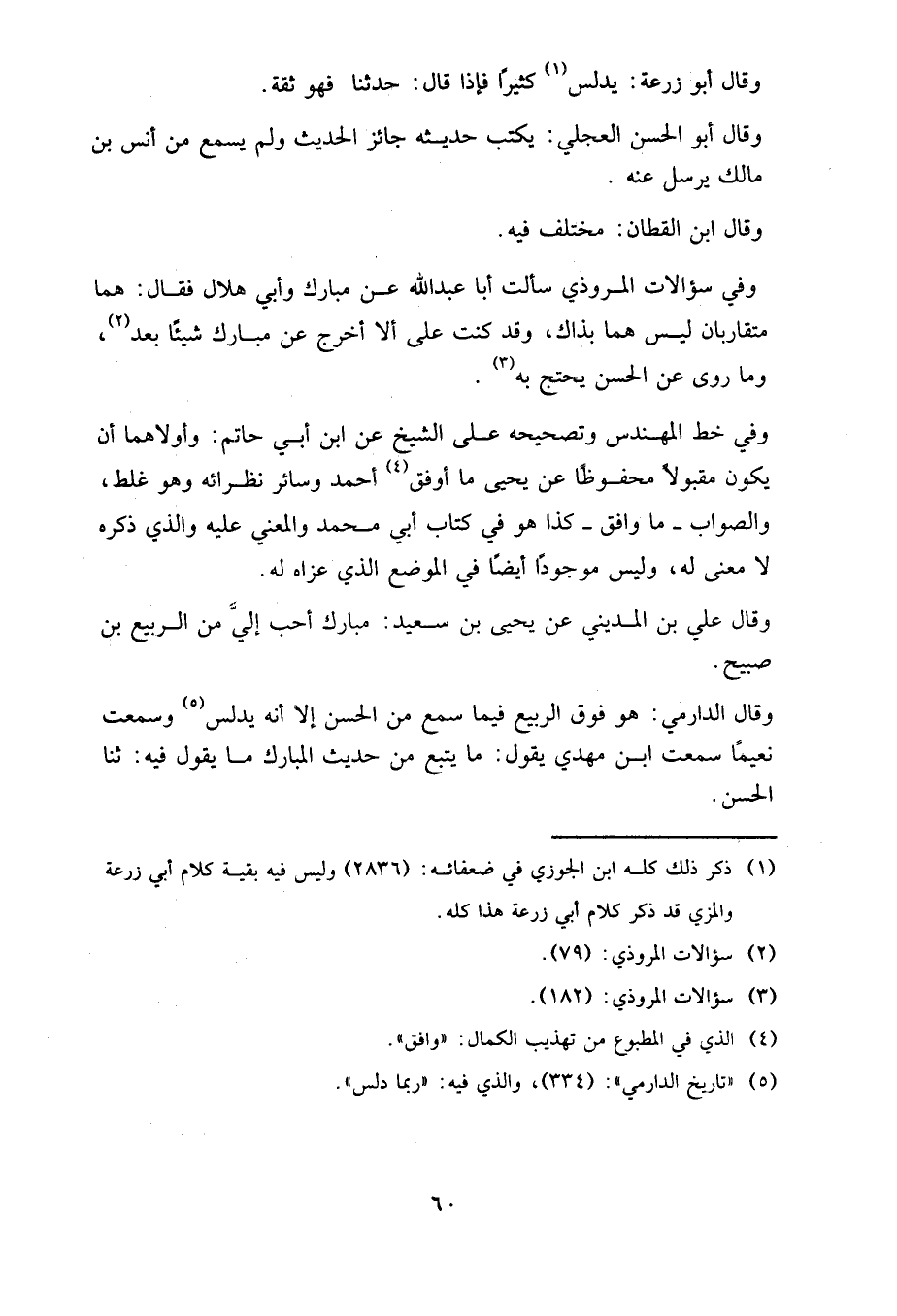 وقال الدارمي: هو فوق الربيع فيما سمع من الحسن إلا أنه يدلس، وسمعت نعيما، سمعت ابن مهدي يقول: ما يتبع من حديث المبارك ما يقول فيه: ثنا الحسن.