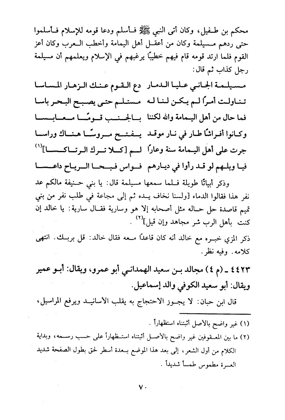 وذكر أبياتا طويلة، فلما سمعها مسيلمة قال: يا بني حنيفة، ما لكم عد نفر هذا، فقالوا: الدماء ولسنا نخاف يده، ثم إلى مجاعة في طلب نفر من بني تميم قاصدة حل حاله مثل أصحابه إلا هو وسارية، فقال سارية: يا خالد، إن كنت بأهل الرب شر مجاهد وإن قيل.