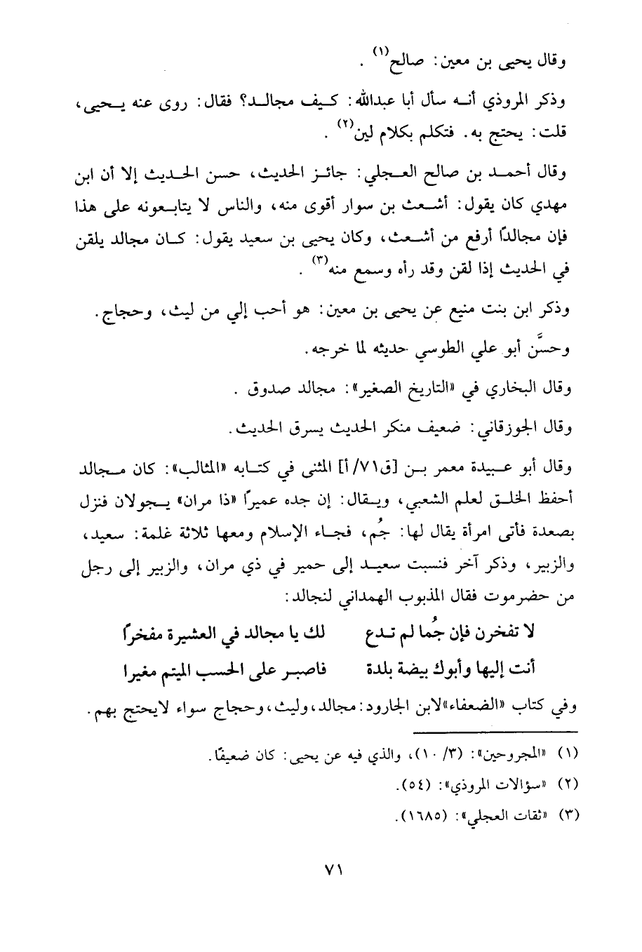 وفي كتاب «الضعفاء» لابن الجارود: مجالد وليث وحجاج سواء، لا يحتج بهم.
