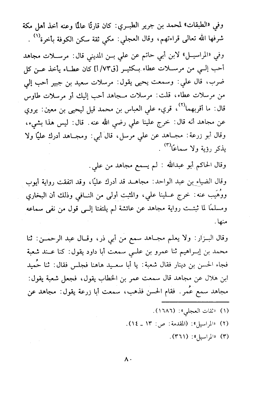 وفي «المراسيل» لابن أبي حاتم عن علي بن المديني قال: مرسلات مجاهد أحب إلي من مرسلات عطاء بكثير، كان عطاء يأخذ عن كل ضرب، قال علي: وسمعت يحيى يقول: مرسلات سعيد بن جبير أحب إلي من مرسلات عطاء، قلت: مرسلات مجاهد أحب إليك أو مرسلات طاوس؟ قال: ما أقربهما. قرئ علي العباس بن محمد: قيل ليحيى بن معين: يروي عن مجاهد أنه قال: خرج علينا علي رضي الله عنه، قال: ليس هذا بشيء، وقال أبو زرعة: مجاهد عن علي مرسل، قال أبي: ومجاهد أدرك عليا، ولا يذكر رؤية ولا سماعا.