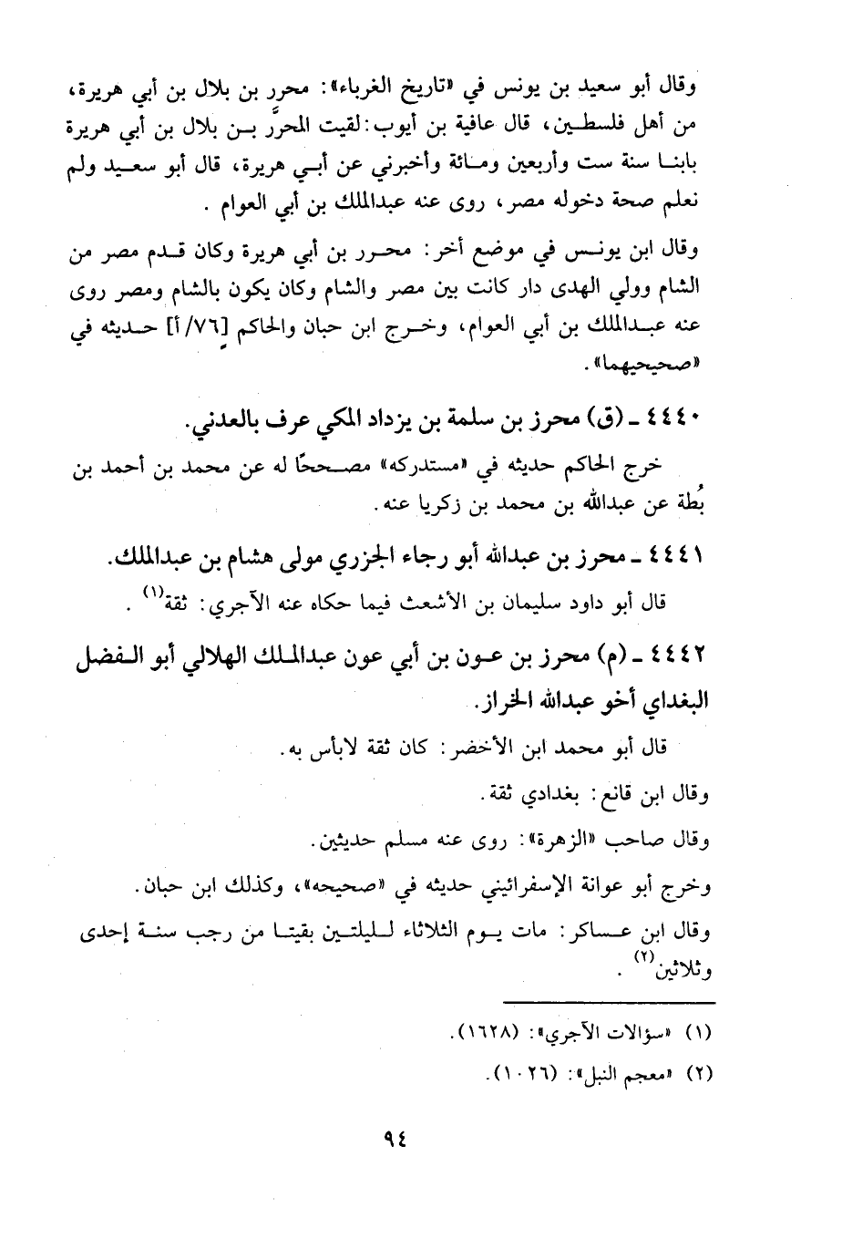 وقال ابن يونس في موضع آخر: محرر بن أبي هريرة، وكان قدم مصر من الشام، وولي الهدى دار كانت بين مصر والشام، وكان يكون بالشام ومصر، روى عنه عبد الملك بن أبي العوام، وخرج ابن حبان والحاكم حديثه في «صحيحيهما».