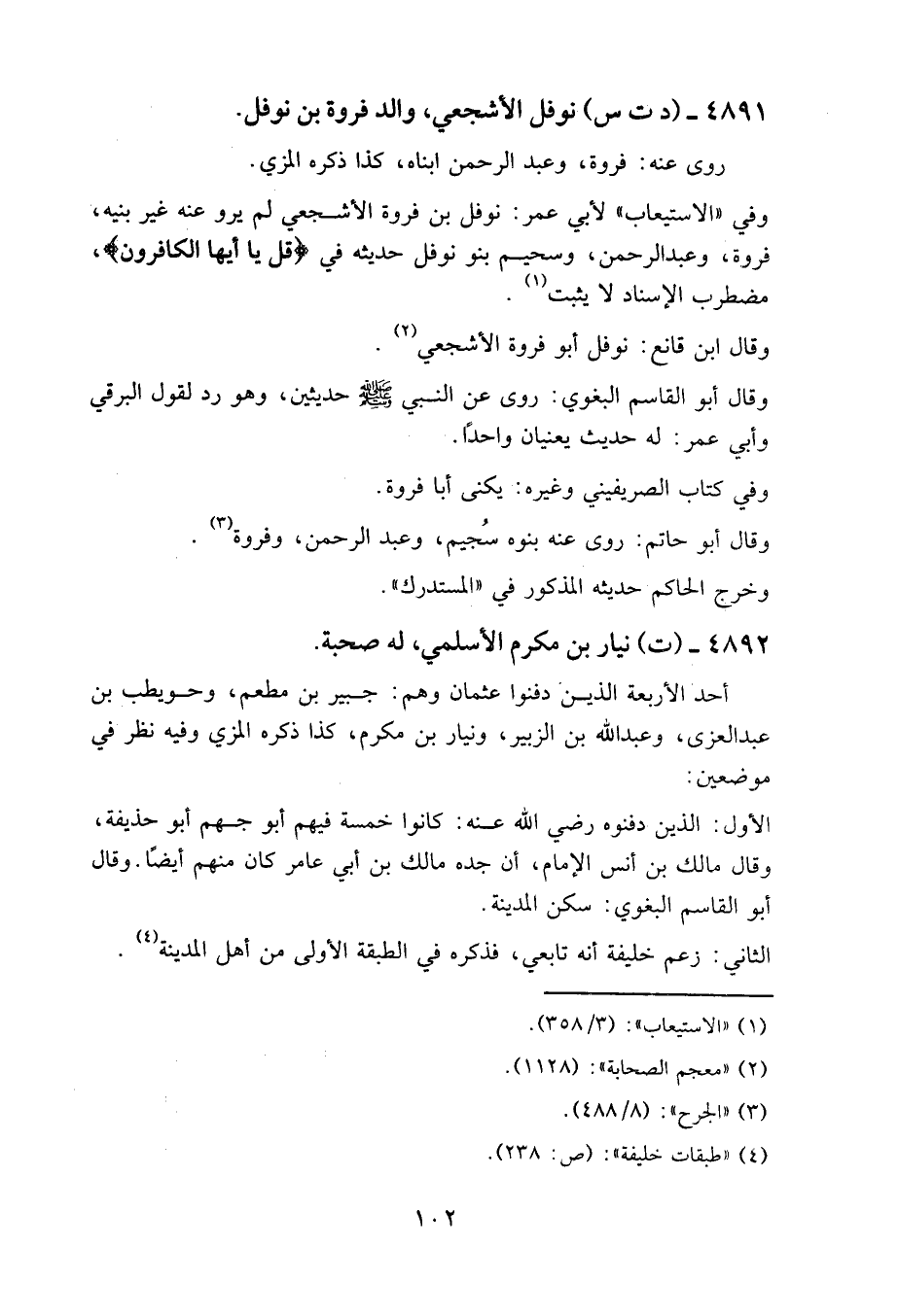 وفي «الاستيعاب» لأبي عمر: نوفل بن فروة الأشجعي، لم يرو عنه غير بنيه: فروة، وعبد الرحمن، وسحيم بنو نوفل حديثه في " قل يا أيها الكافرون "، مضطرب الإسناد لا يثبت.
