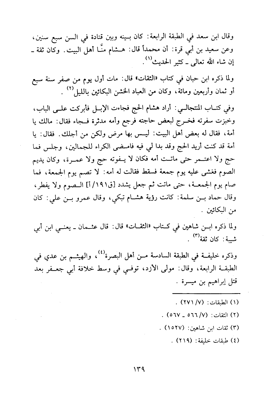 وقال ابن سعد في الطبقة الرابعة: كان بينه وبين قتادة في السن سبع سنين، وعن سعيد بن أبي قرة: أن محمدا قال: هشام منا أهل البيت. وكان ثقة – إن شاء الله تعالى –، كثير الحديث.