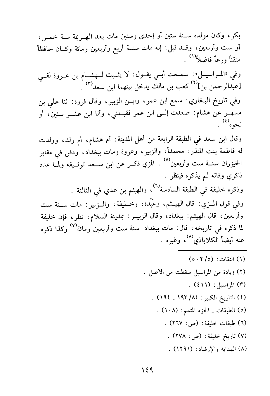 وفي قول المزي: قال الهيثم، وعبدة، وخليفة، والزبير: مات سنة ست وأربعين، قال الهيثم: ببغداد، وقال الزبير: بمدينة السلام - نظر؛ فإن خليفة لما ذكره في تاريخه، قال: مات ببغداد سنة ست وأربعين ومائة، وكذا ذكره عنه أيضا الكلاباذي، وغيره.