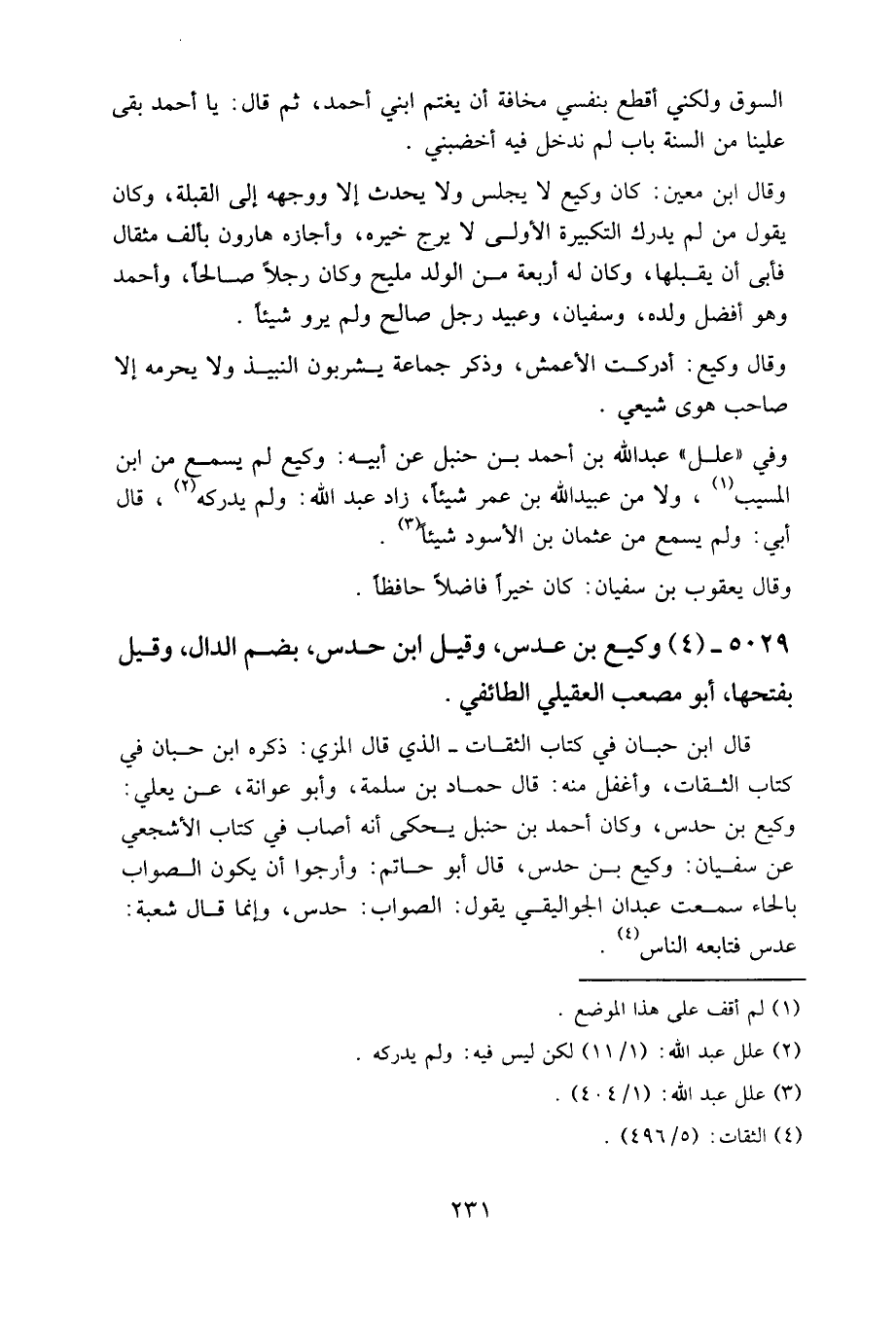 وفي «علل» عبد الله بن أحمد بن حنبل عن أبيه: وكيع لم يسمع من ابن المسيب، ولا من عبيد الله بن عمر شيئا، زاد عبد الله: ولم يدركه، قال أبي: ولم يسمع من عثمان بن الأسود شيئا.
