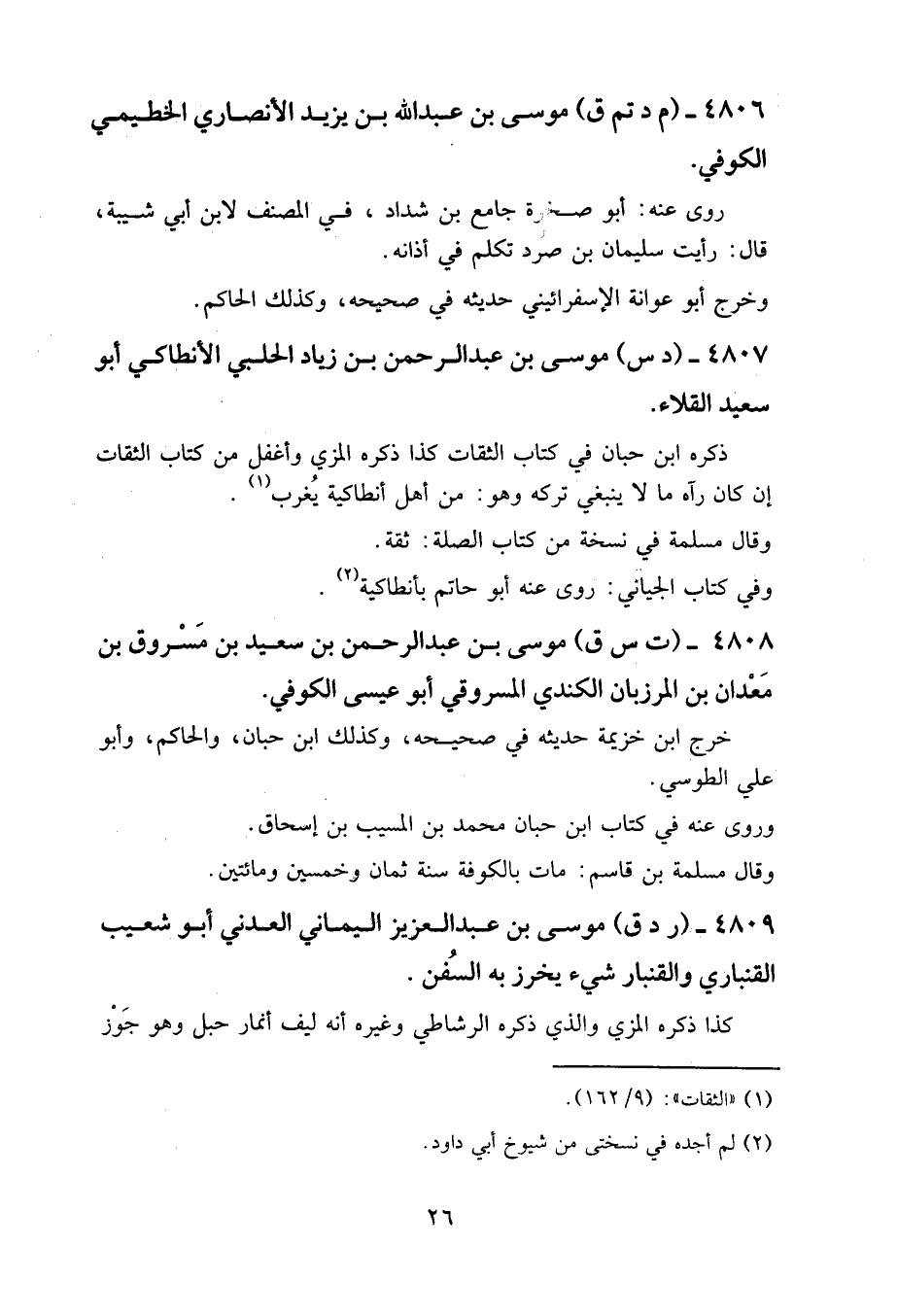 ٤٨٠٨ - (ت س ق) موسى بن عبد الرحمن بن سعيد بن مسروق بن معدان بن المرزبان الكندي المسروقي، أبو عيسى الكوفي.