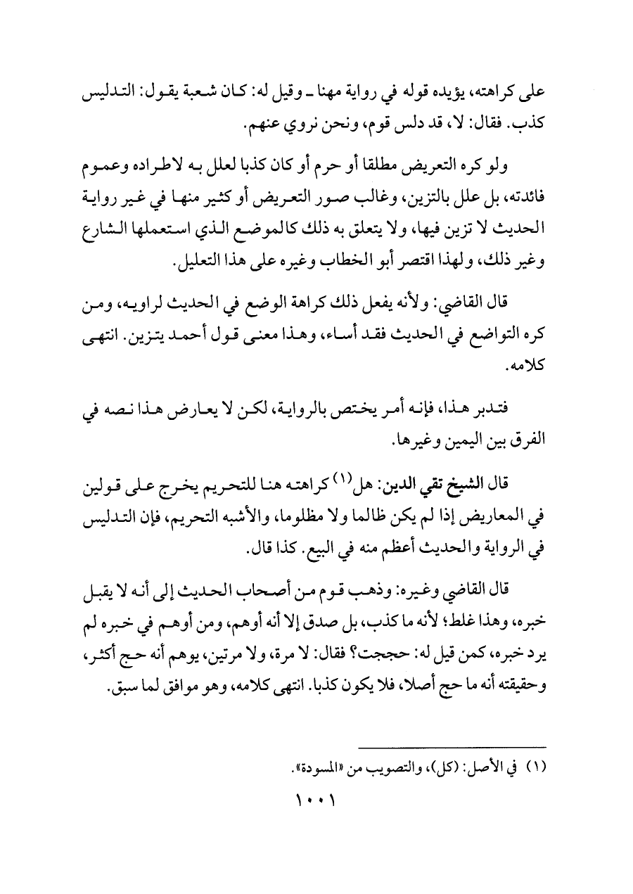 قال الشيخ تقي الدين: هل (¬١) كراهته هنا للتحريم يخرج على قولين في المعاريض إذا لم يكن ظالما ولا مظلوما، والأشبه التحريم، فإن التدليس في الرواية والحديث أعظم منه في البيع. كذا قال.