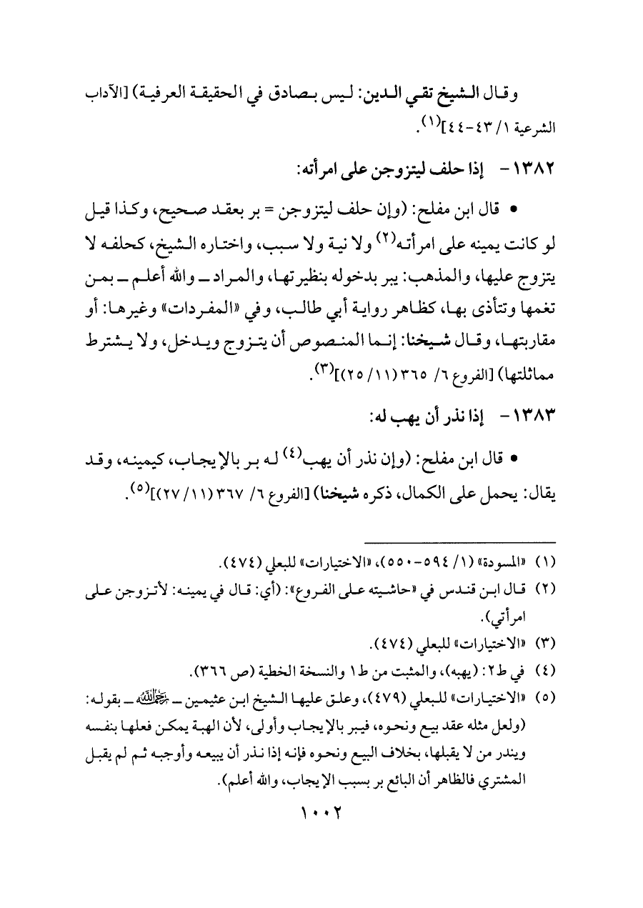 (¬٥) «الاختيارات» للبعلي (٤٧٩)، وعلق عليها الشيخ ابن عثيمين ــ - رحمه الله - ــ بقوله: (ولعل مثله عقد بيع ونحوه، فيبر بالإيجاب وأولى، لأن الهبة يمكن فعلها بنفسه ويندر من لا يقبلها، بخلاف البيع ونحوه فإنه إذا نذر أن يبيعه وأوجبه ثم لم يقبل المشتري فالظاهر أن البائع بر بسبب الإيجاب، والله أعلم).