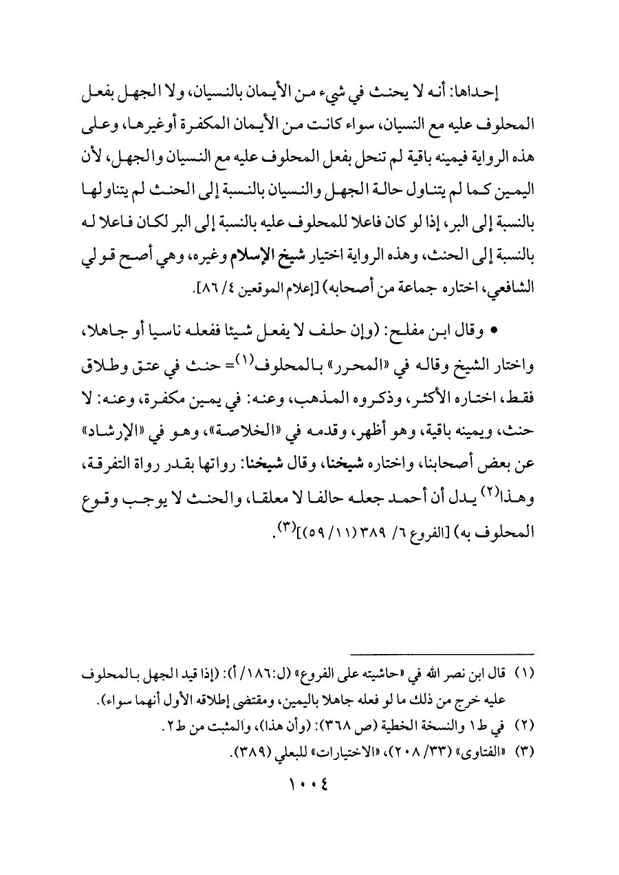 (¬١) قال ابن نصر الله في «حاشيته على الفروع» (ل: ١٨٦/أ): (إذا قيد الجهل بالمحلوف عليه خرج من ذلك ما لو فعله جاهلا باليمين، ومقتضى إطلاقه الأول أنهما سواء).