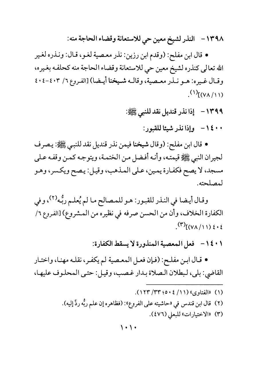 - قال ابن مفلح: (وقال شيخنا فيمن نذر قنديل نقد للنبي - صلى الله عليه وسلم -: يصرف لجيران النبي - صلى الله عليه وسلم - قيمته، وأنه أفضل من الختمة، ويتوجه كمن وقفه على مسجد، لا يصح فكفارة يمين، على المذهب، وقيل: يصح ويكسر، وهو لمصلحته.
